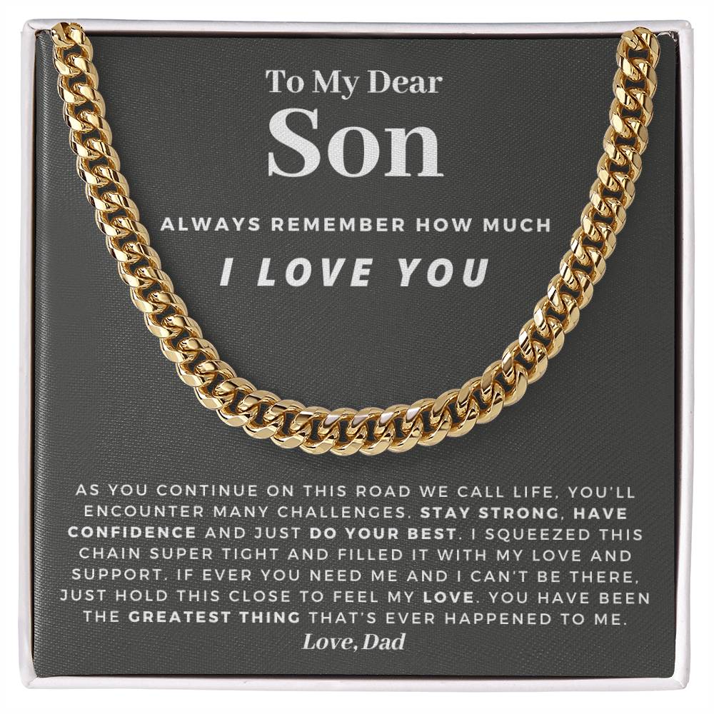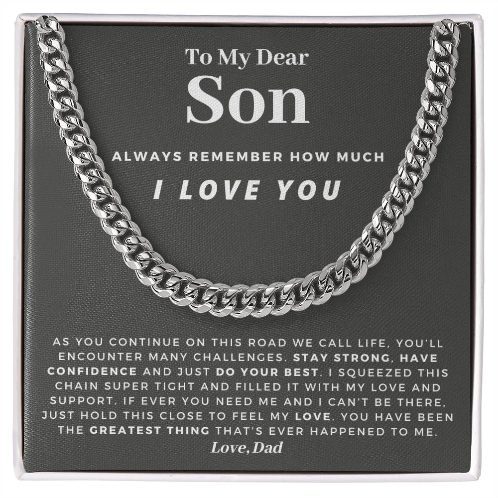 The Message Says: "Always remember how much I love you. As you continue on this road we call life, you'll encounter many challenges. Stay strong, have confidence and just do your best. I squeezed this chain super tight and filled it with my love and support. If you ever need me and I can't be there, just hold this close to feel my love. You have been the greatest thing that's ever happened to me. Love, Dad"